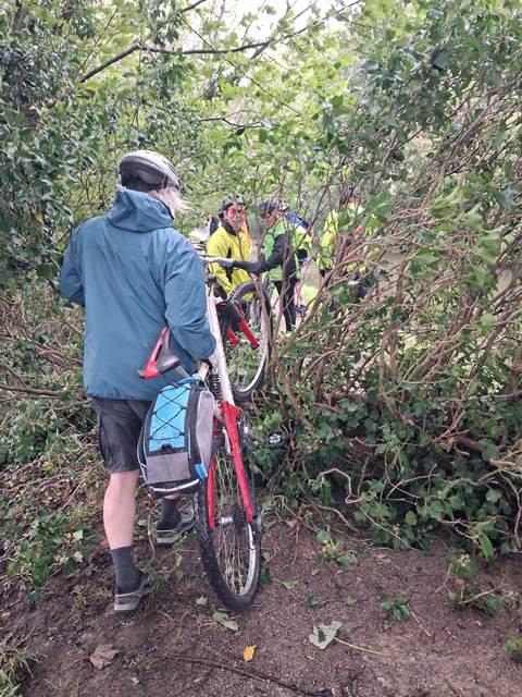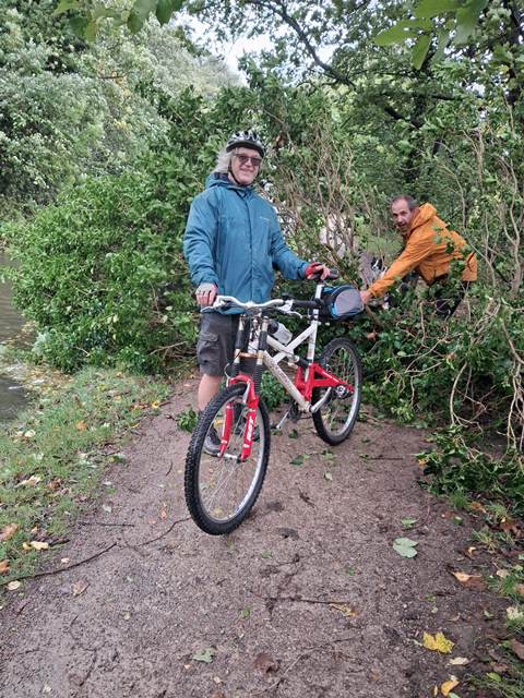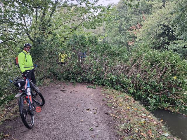 Back on track and with the wind and the rain Graeme gets close to the edge of the path and the edge gives way and down he goes. Fortunately he is on the edge away from the canal side, however it is a steep bank so he is lucky he landed on the path and did not disappear down the bank side.