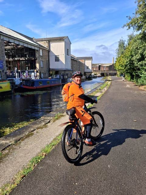 We assure him we will be fine as we are experienced cyclists and also have a back up van if required. To get onto the canal side we have to cross the railway line, the only way to do this is to use a footbridge, so we start the ride by carrying the bikes up and down a flight of stairs. then we join the path leading towards the canal, Graeme is leading and only sees the part of the sign that says Leeds, so he turns right, I have to call him back and point out the rest of the sign. The path leads us down onto the canal side, it is wide flat and very scenic with locks and wildlife, so after the little difficulties at the start we are happy and on our way. passing nice canal side properties and old mills. All of which we find very interesting