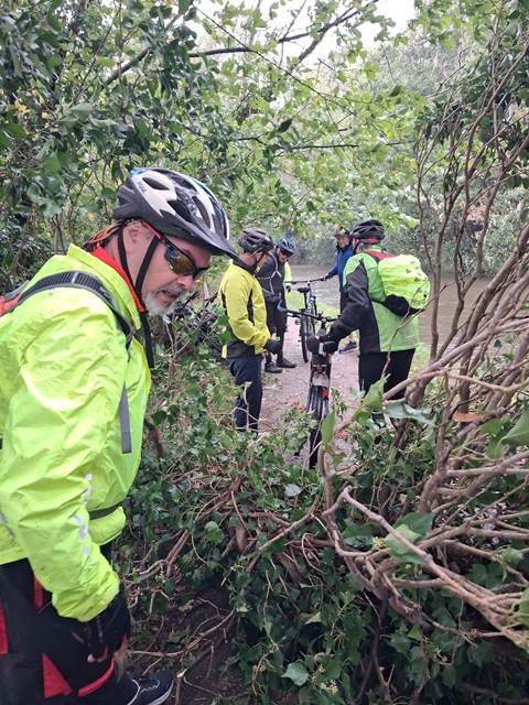 Back on track and with the wind and the rain Graeme gets close to the edge of the path and the edge gives way and down he goes. Fortunately he is on the edge away from the canal side, however it is a steep bank so he is lucky he landed on the path and did not disappear down the bank side.